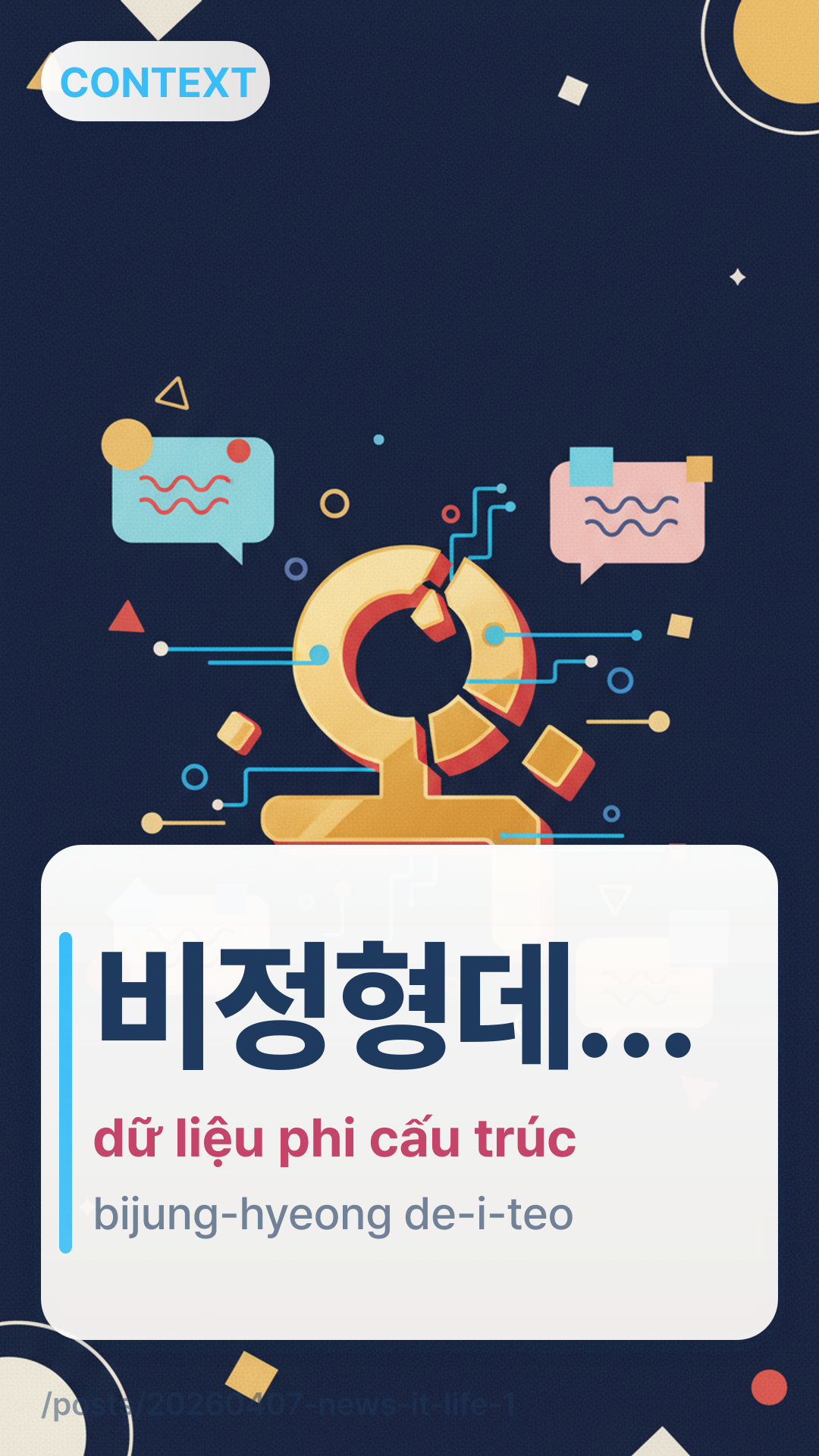 비정형데이터는 인공지능 학습에 꼭 필요합니다.bijeonghyeongdeiteoneun ingongjineung hakseube kkok piryohapnida. — Dữ liệu phi cấu trúc là rất cần thiết cho việc học của trí tuệ nhân tạo.