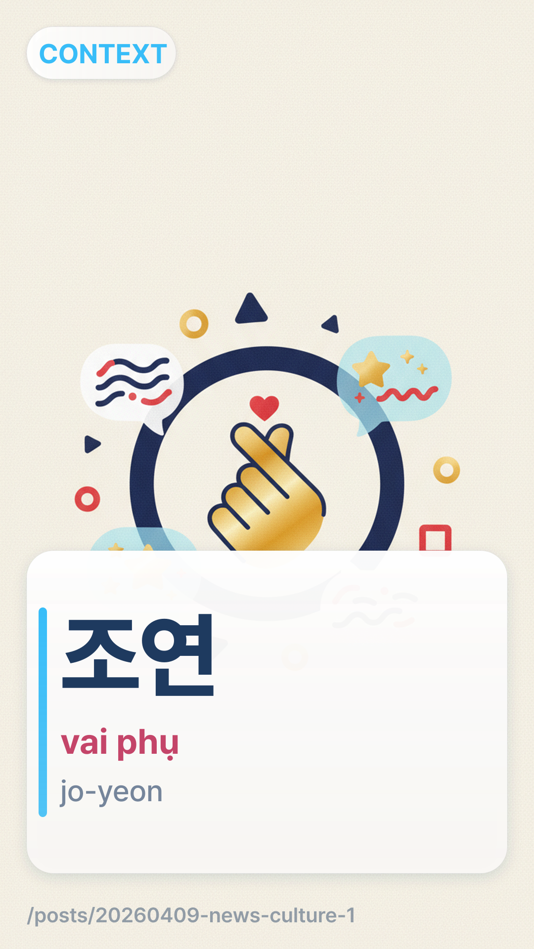 Trong ngữ cảnh của bài báo, 조연joyeon dùng để chỉ một vai phụ hoặc một nhân vật thứ yếu trong một vở kịch, bộ phim điện ảnh hoặc truyền hình. Chủ tịch Chung Ju-yung đã sử dụng thuật ngữ này để bày tỏ sự thất vọng khi bộ phim coi nhà sáng lập công ty ít quan trọng hơn nhân viên.