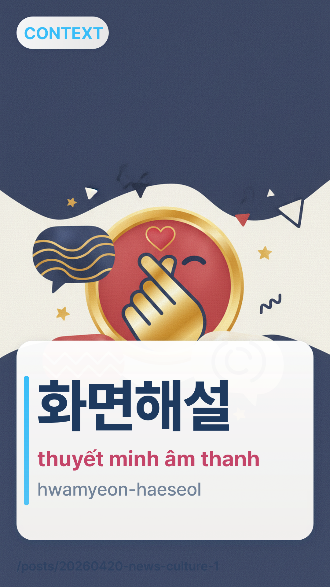 화면해설 덕분에 내용을 더 잘 이해했어요.hwamyeonhaeseol deokbune naeyoeul deo jal ihaehaesseoyo. — Tôi đã hiểu nội dung tốt hơn nhờ thuyết minh âm thanh.