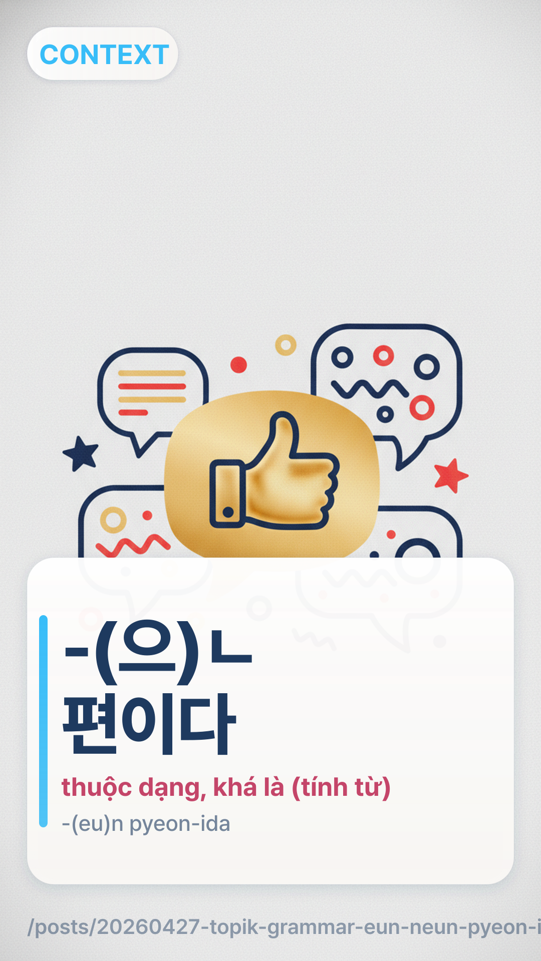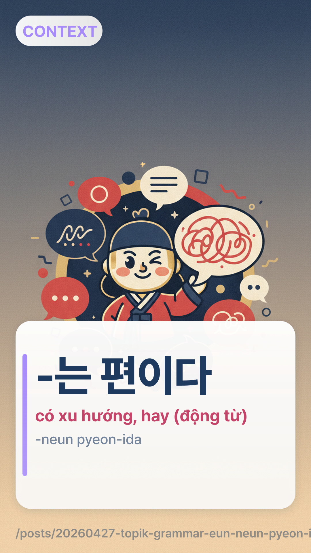 Nắm vững ngữ pháp TOPIK II -(으)ㄴ/는 편이다 để mô tả thói quen và xu hướng. Học cách tránh các lỗi phổ biến và nói chuyện tự nhiên hơn.