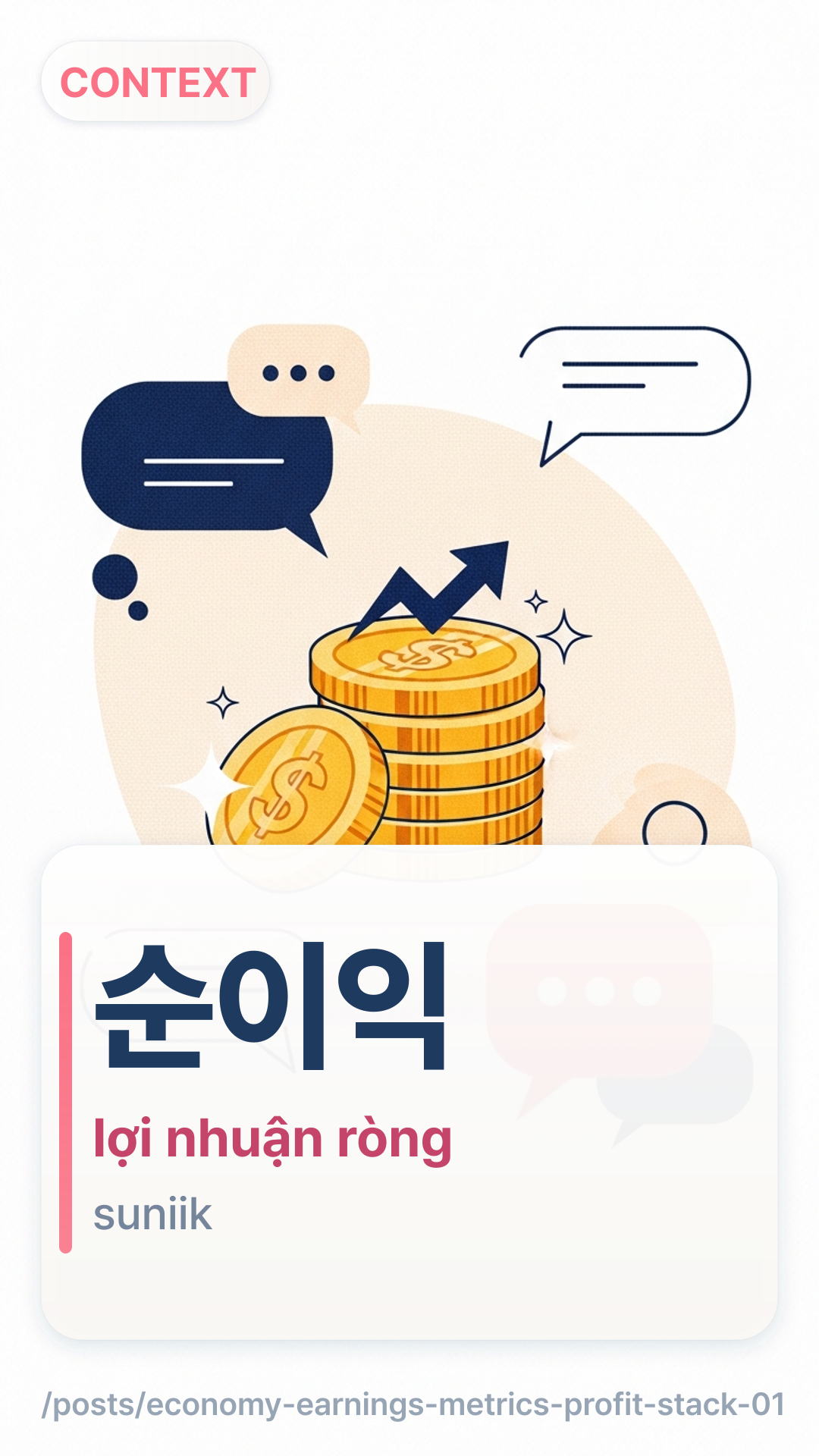 일회성 요인으로 순이익이 크게 늘었습니다.ilhoeseong yoineuro suniigi keuge neureotseupnida. — Lợi nhuận ròng tăng mạnh do yếu tố một lần.순이익 적자 전환suniik jeokja jeonhwan — Chuyển sang lỗ ròng.영업이익이 좋아도 순이익은 다르게 나올 수 있습니다.yeoeobiigi johado suniigeun dareuge naol su itseupnida. — Dù lợi nhuận hoạt động mạnh, lợi nhuận ròng vẫn có thể khác.