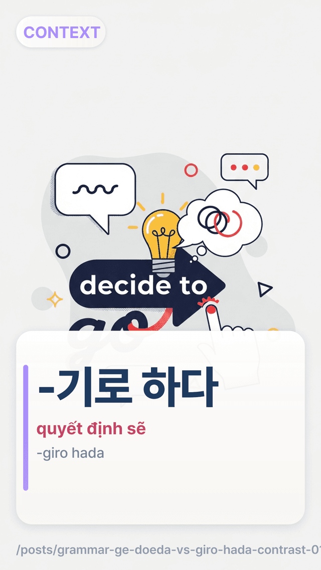 Dạy -게 되다-ge doeda vs -기로 하다-giro hada bằng thước đo mức độ chủ động (lựa chọn→hoàn cảnh) và các “từ kích hoạt” (결국/어쩌다), rồi luyện 12 câu viết lại kiểu chat.