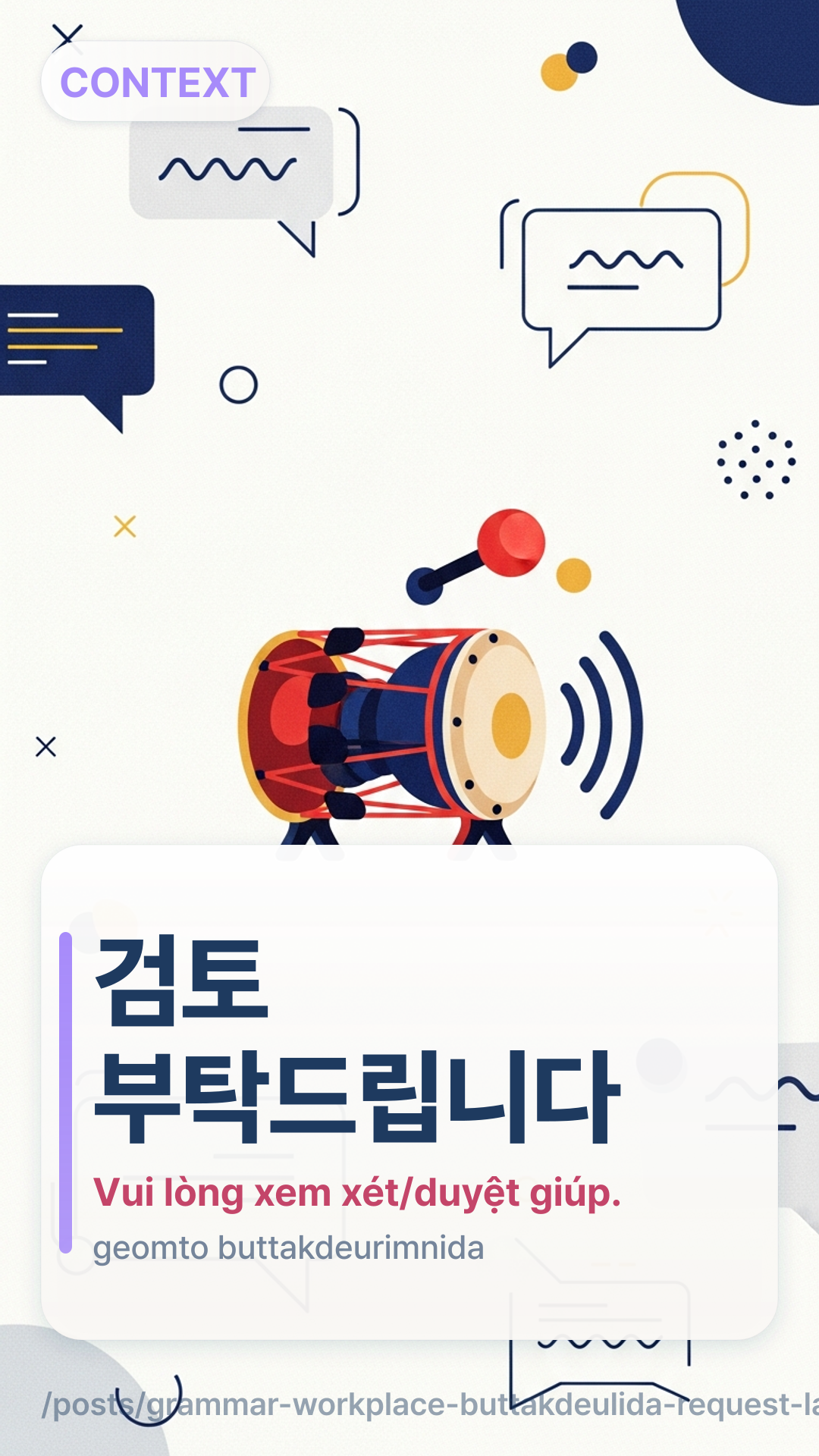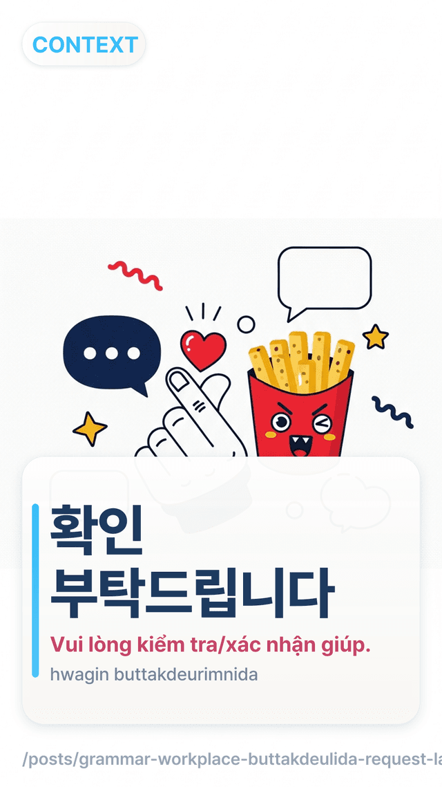 Dạy ‘확인 부탁드립니다’ bằng “thang yêu cầu 3 mức”, rồi viết lại 12 câu Slack cộc lốc thành tiếng Hàn tự nhiên mà không nghe như đang đá xoáy.