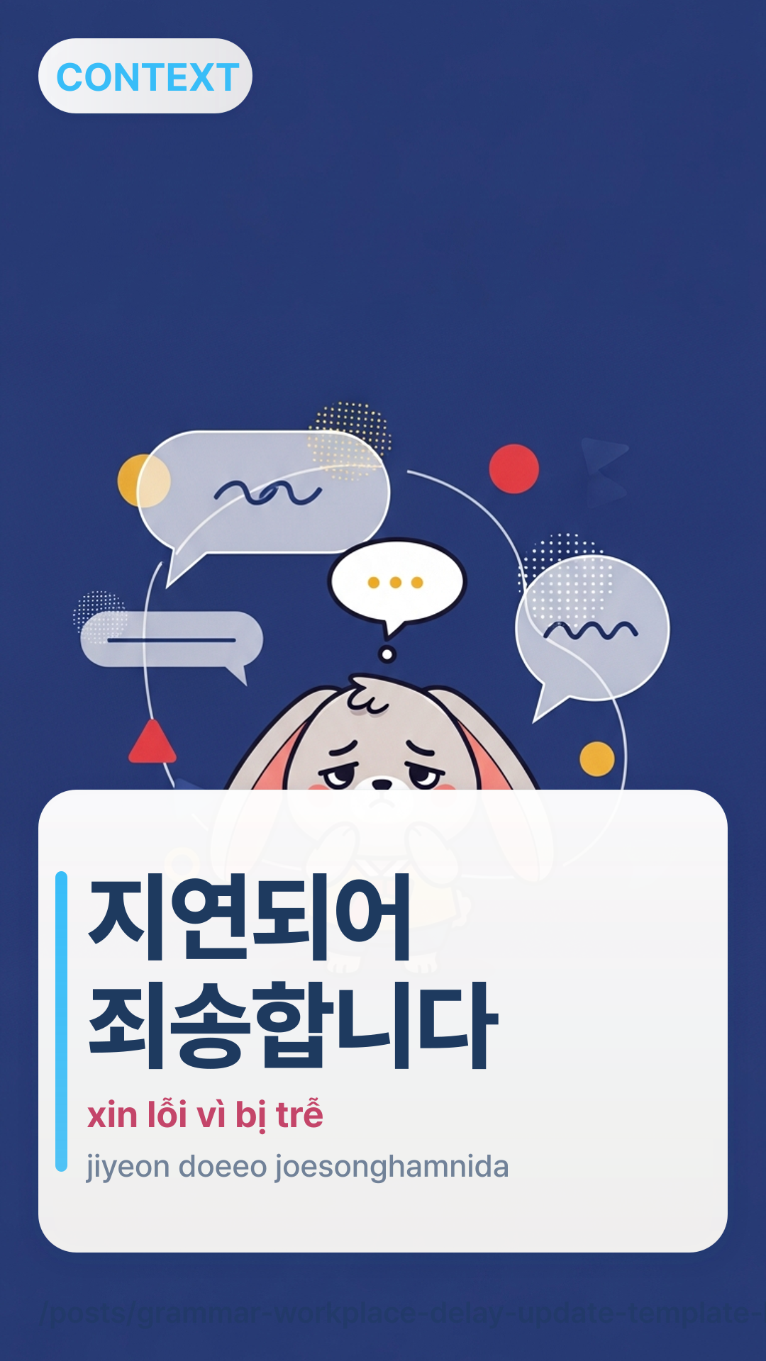 지연되어 죄송합니다. {현재 상태} 중이며 {다음 액션} 후 {시간}까지 공유드리겠습니다.jiyeondoeeo joesonghapnida. {hyeonjae sangtae} juimyeo {daeum aeksyeon} hu {sigan}kkaji goyudeurigetseupnida. — Xin lỗi vì bị trễ. Tôi đang {trạng thái} và sẽ chia sẻ trước {thời gian} sau khi {hành động tiếp theo}.