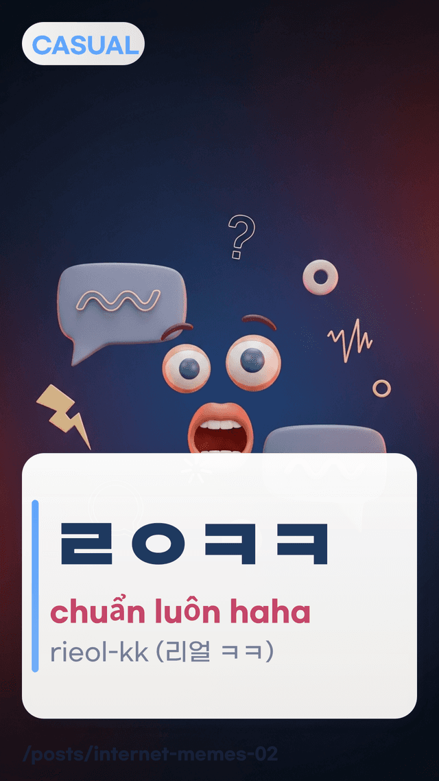 ㄹㅇrieol là “real” (리얼), và ㄹㅇㅋㅋㄹㅇㅋㅋ nghĩa là “chuẩn luôn haha.” Nó dùng cho những lúc vừa đúng vừa buồn cười, hoặc vô lý đến mức bạn không nhịn cười được.