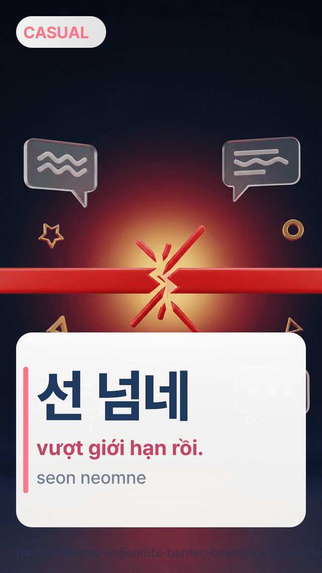그만해 주세요. 선 넘는 말이에요geumanhae juseyo. seon neomneun marieyo — Làm ơn dừng lại. Câu đó vượt giới hạn