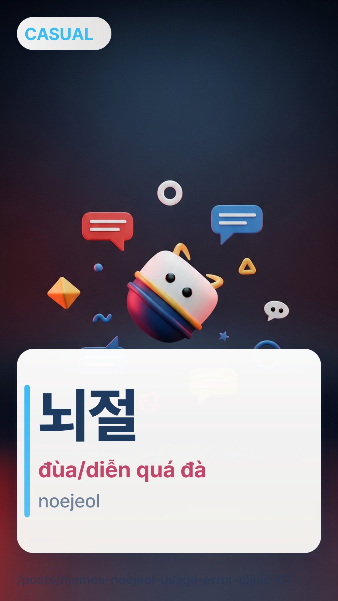 Đây là một “phòng khám lỗi”: mục tiêu không phải “dùng nhiều tiếng lóng hơn”, mà là “nói cùng ý nhưng không làm không khí lạnh ngắt”. Mình đã học bài này theo cách đau đớn khi một người bạn chỉ trả lời ... trong group chat—cái 뇌절noejeol “đùa cho vui” của mình lại nghe như đang mắng.