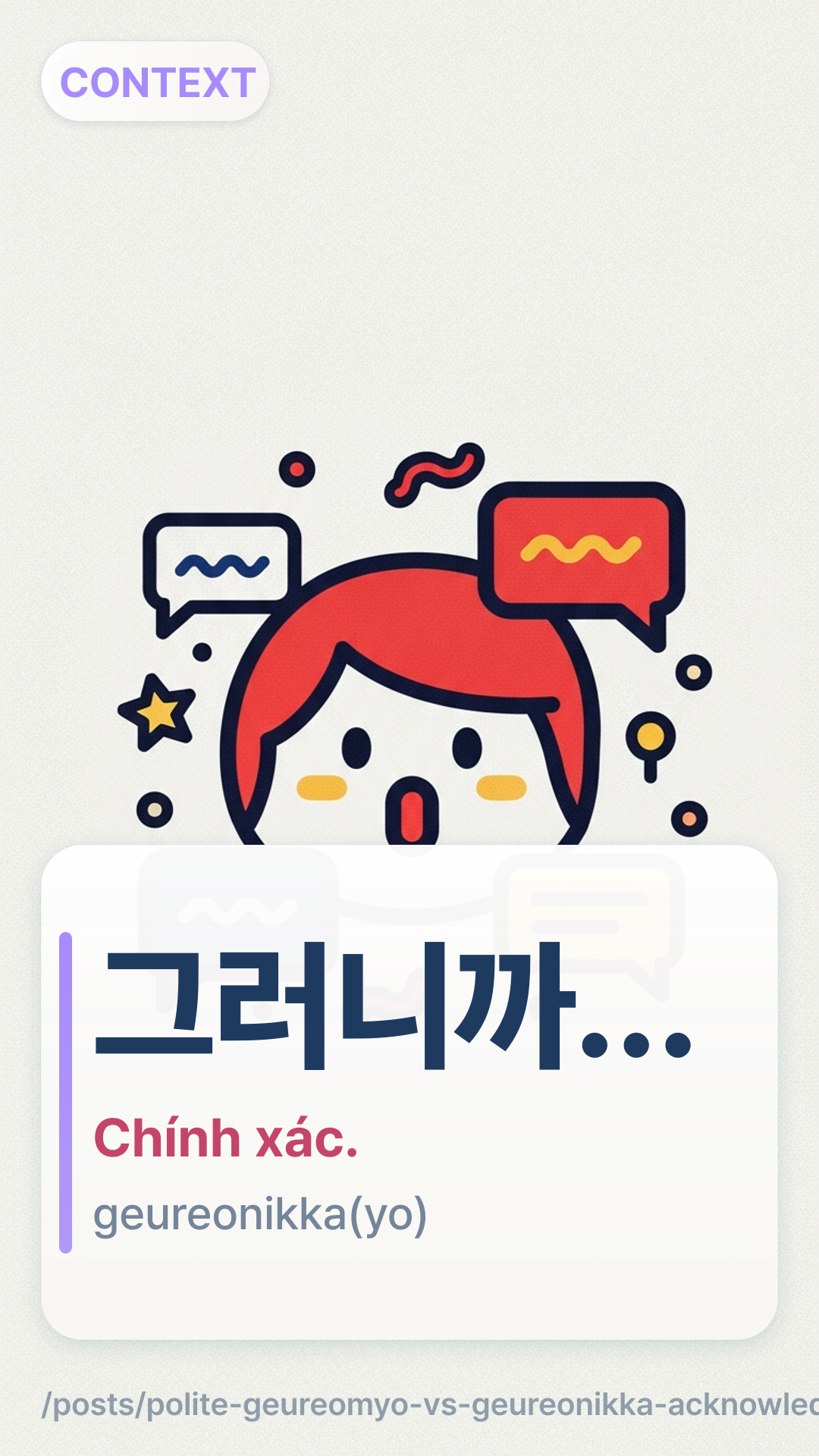 Bẫy thường gặp: dùng 그러니까요geureonikkayo như một “vâng” lịch sự trong chat dịch vụ. Nó có thể nghe như “Đúng vậy, thế nên…” hơn là một sự chấp nhận gọn gàng.