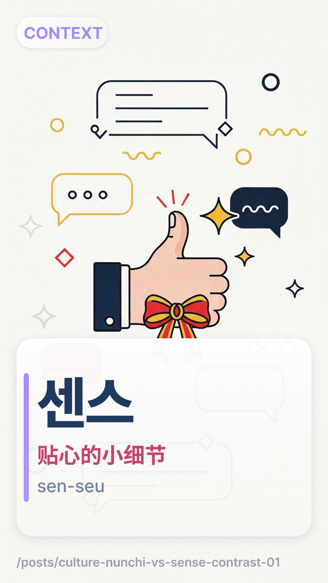 当目标是增加舒适感、精致度或一个让人愉快的小惊喜时用 센스senseu:更合适的措辞、更体贴的时机,或一个让流程更顺滑的小细节。它也常作为夸奖使用。