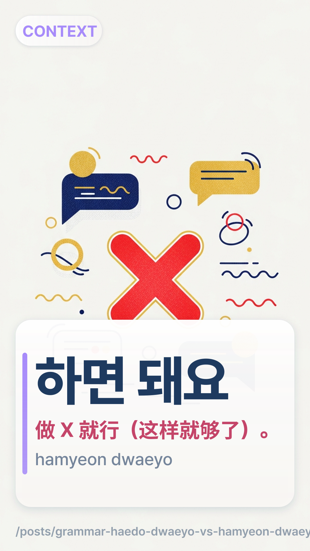 用 해도 돼요haedo dwaeyo 来询问/给予许可;用 하면 돼요hamyeon dwaeyo 来表达“这样就够了 / 只要做 X 就行”(常带有指示/步骤感)。