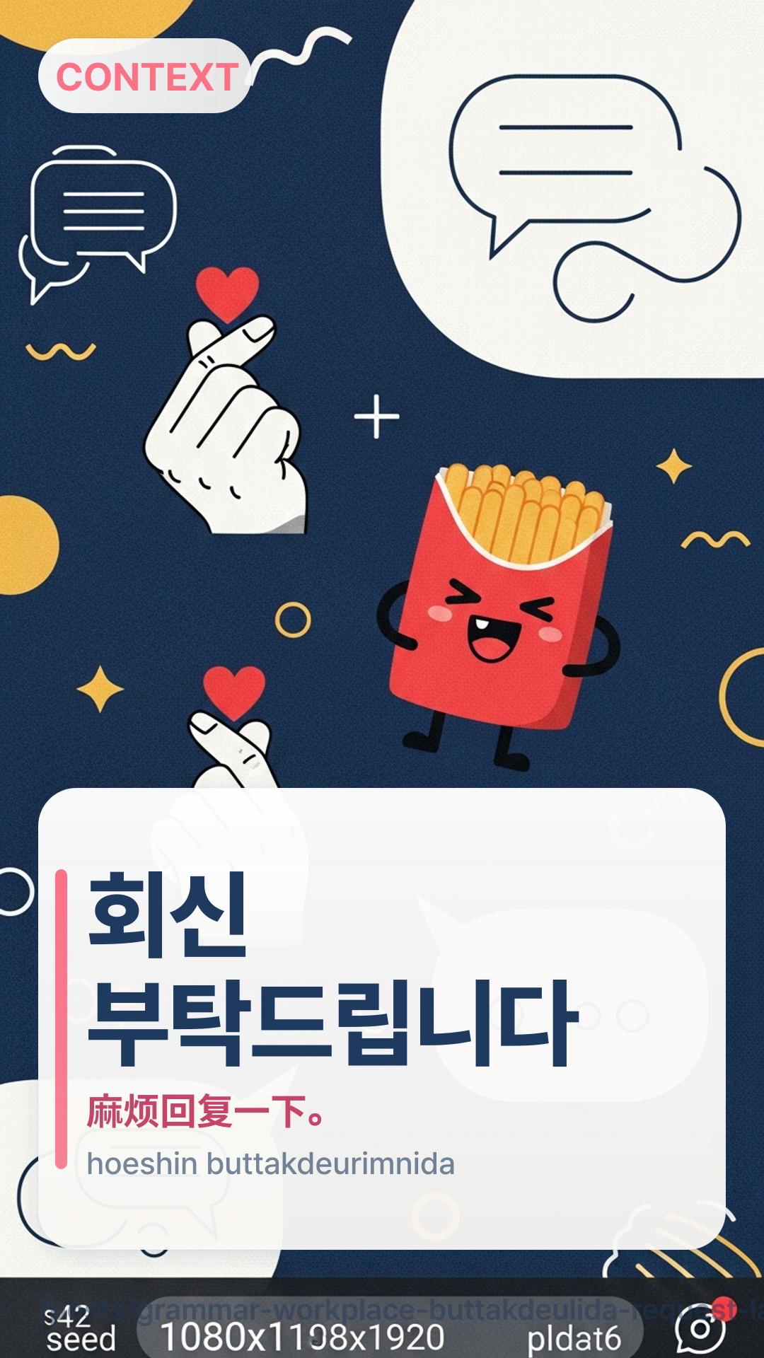 你发了文件或消息,需要对方检查、审阅或回复,才能继续推进。在很多韩国职场里,同一句短话可能显得高效——也可能因为你选的“请求结尾”以及是否补充背景而听起来偏冲。