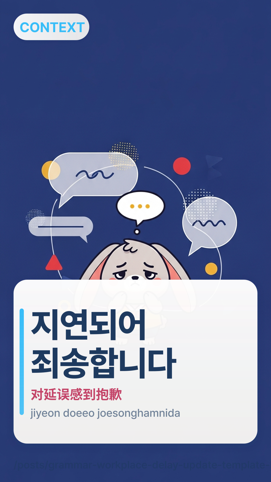 지연되어 죄송합니다. {현재 상태} 중이며 {다음 액션} 후 {시간}까지 공유드리겠습니다.jiyeondoeeo joesonghapnida. {hyeonjae sangtae} juimyeo {daeum aeksyeon} hu {sigan}kkaji goyudeurigetseupnida. — 抱歉延误。我正在{状态},会在完成{下一步动作}后,于{时间}前分享。