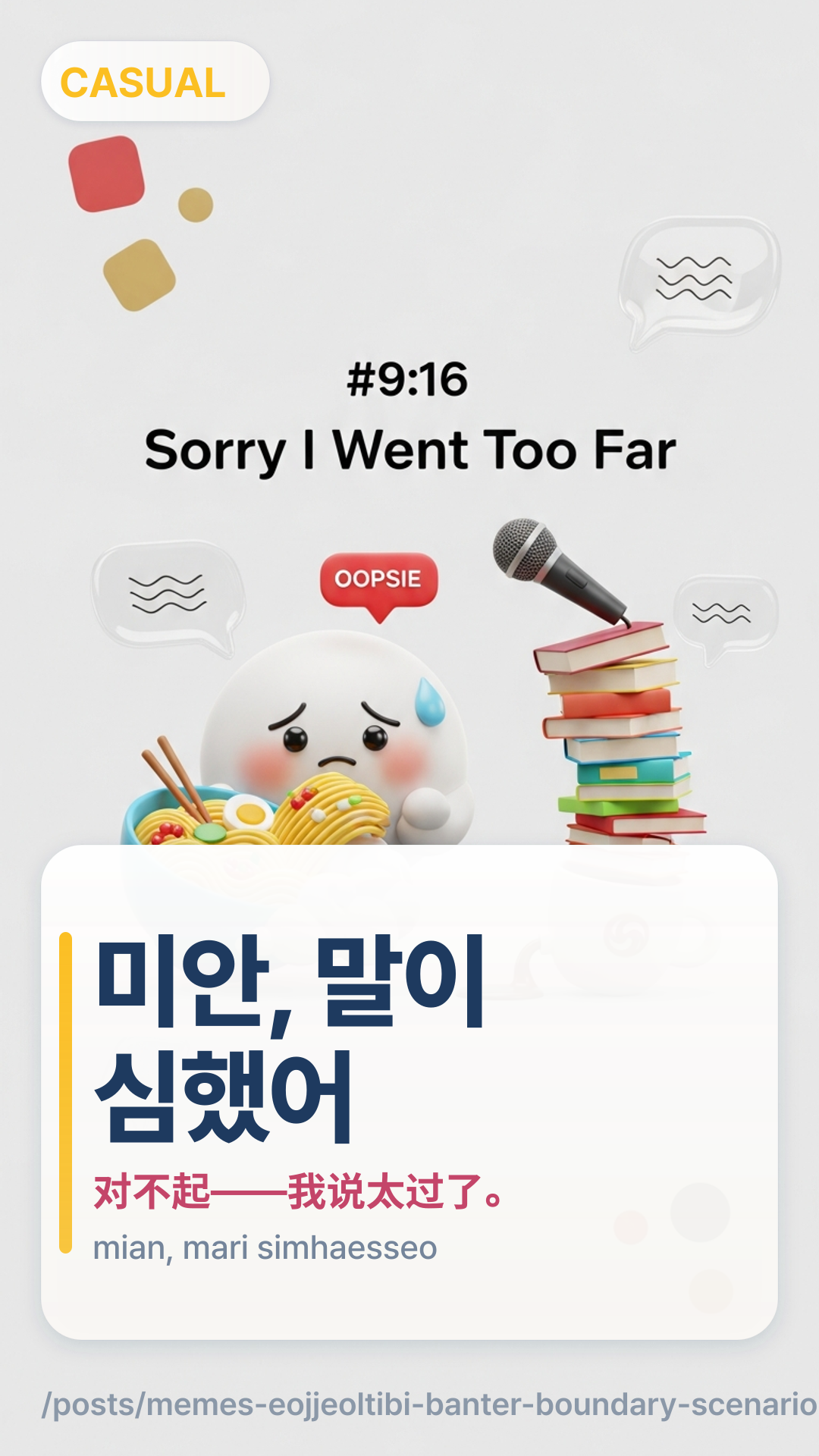 这个修复句承认“说过头了”,但不长篇解释。尤其适合在 그만해geumanhae 或 선 넘네seon neomne 之后立刻用。陷阱是马上加借口;先短句道歉更有效。