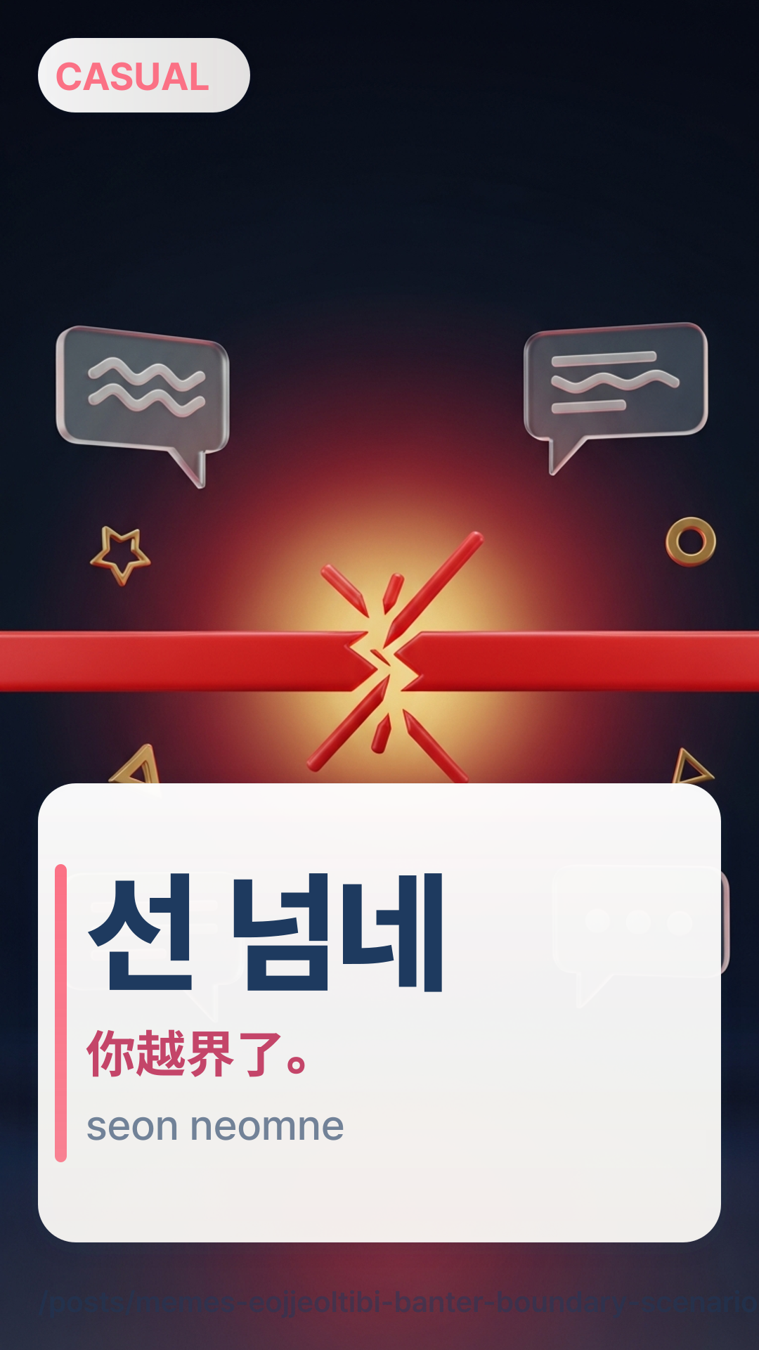 미안, 말이 심했어mian, mari simhaesseo 承认你说过头并释放修复信号;在边界之后用어쩔티비eojjeoltibi/어쩔~eojjeol~ 这种梗式回避通常会升级。 - Q2: