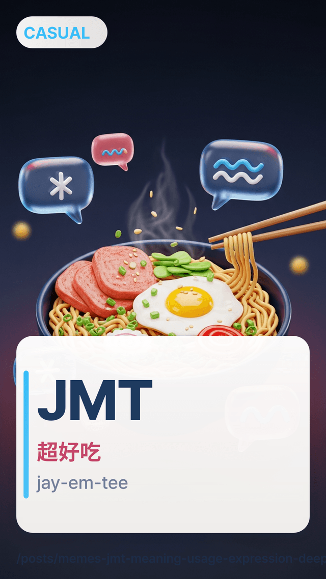 我第一次注意到它是在 Instagram 上一条深夜便利店零食测评下面:有人发了一张很糊的热食吧照片,置顶评论只有 JMT。没有标点、没有上下文——但大家都懂:意思就是“真的、真的很好吃”。