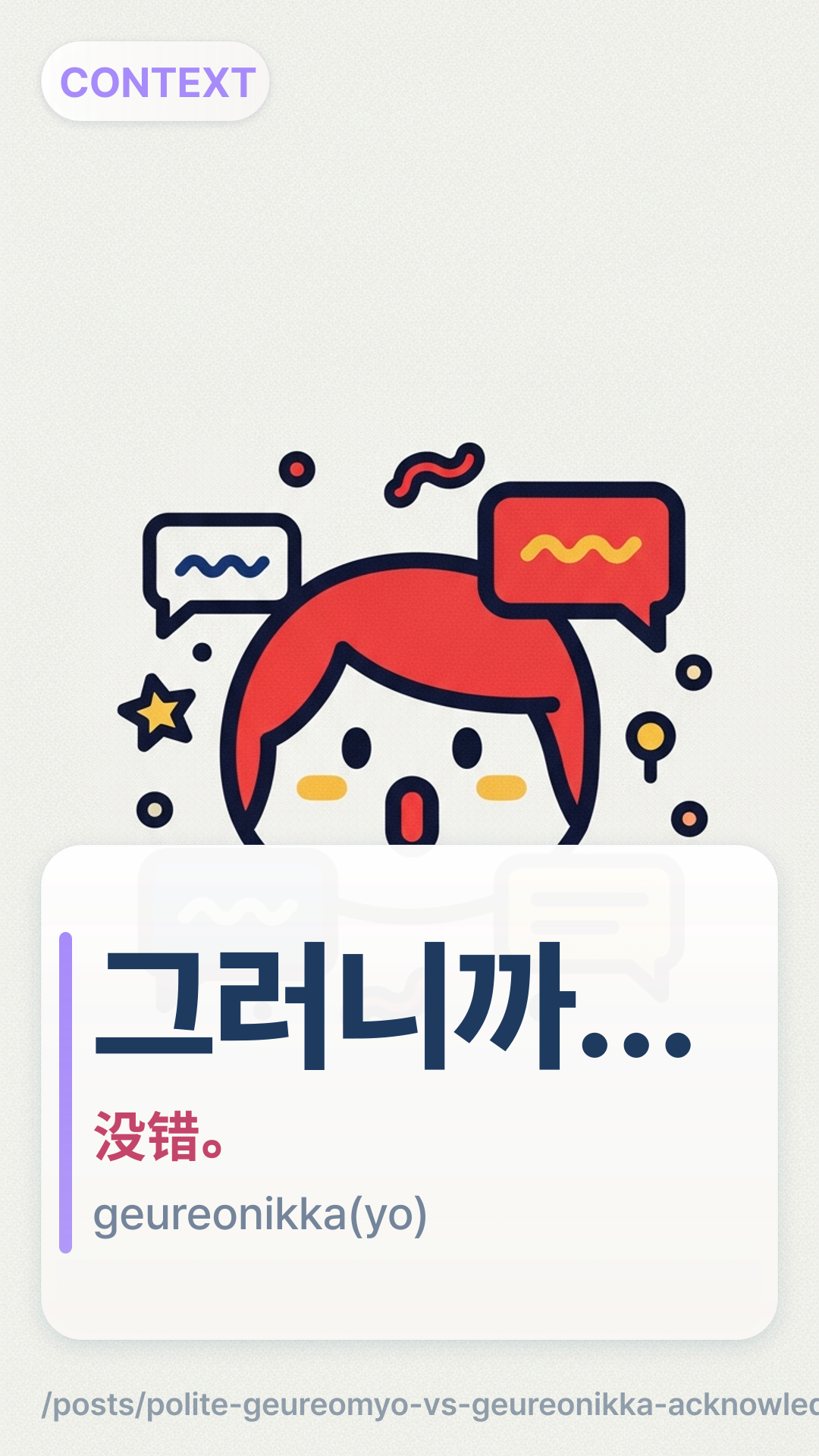 Step 2: 你是在说“没错”并准备补上理由/结论/建议吗?→ 用 그러니까(요)geureonikka(yo)。
