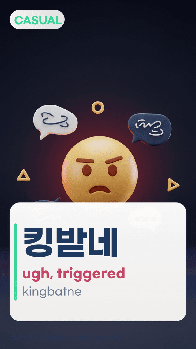 Origin story: Someone combined 킹 (king) with 열받다 (to be heated/annoyed) to create this playful expression. It's like saying "ugh, that's SO annoying" but in a comedic, exaggerated way.